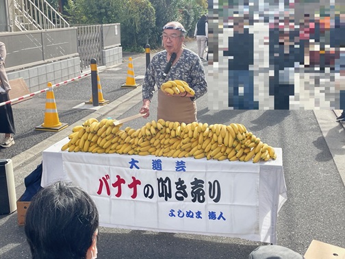 バナナのたたき売りコーナーでは、幼児から高齢者まで、たくさんの方が集まって「もう一声!」の声が飛び交っていました